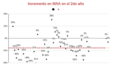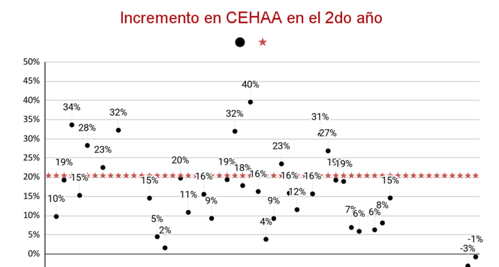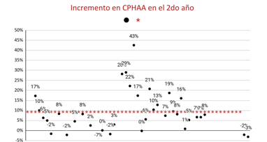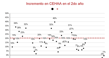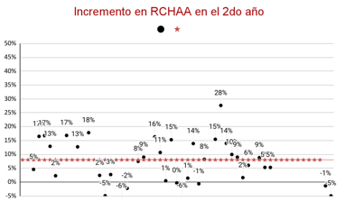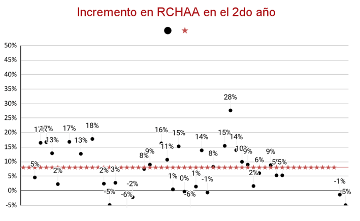 Se observa un incremento promedio del 8% en la cantidad de RCHAA en el segundo año.